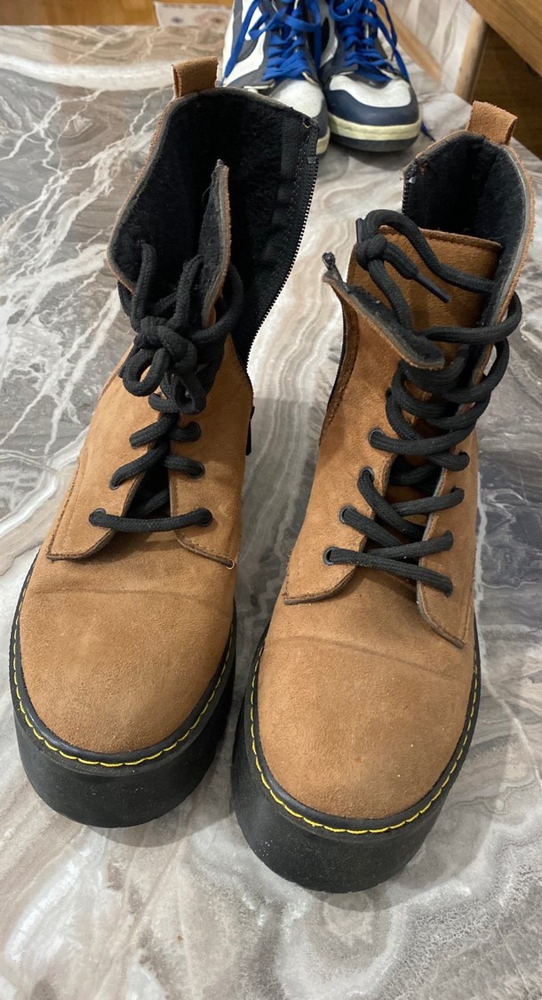 Kahverengi süet, dolgu topuklu kadın botları. Siyah bağcıklı ve tokalı tasarım, rahat ve günlük kullanım için uygun. Sokak stiline uyumlu.