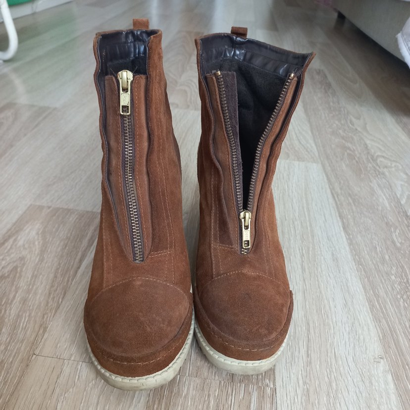 Kahverengi hakiki süet kadın botlar, dolgu topuklu ve ön fermuarlı. Rahat sokak stiline uygun, gündelik kullanıma ideal, desensiz ve koyu tonlarda. Gizli topuk 8.5 sm.