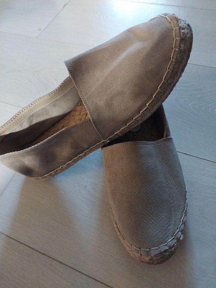 tertemiz espadril.Kahverengi süet dolgu topuk espadriller, minimalist ve bohem tarzda. Desensiz, rahat ve şık, günlük şıklık için uygundur.