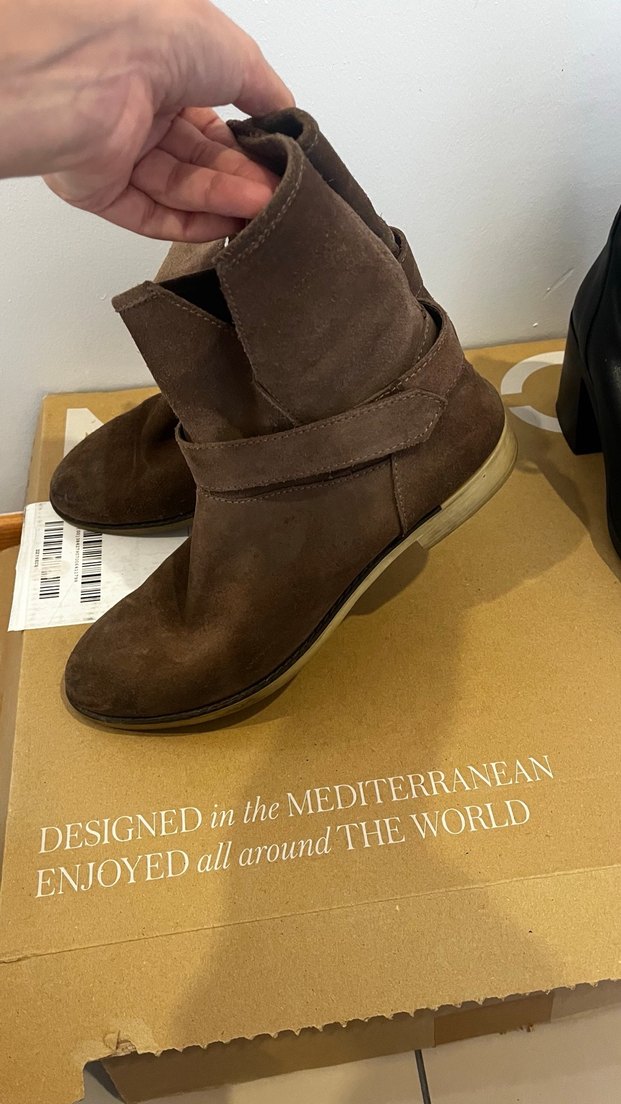 Kahverengi süet kadın botları, dolgu topuklu ve tokalı kayışlı, trend sokak stili için uygundur. Desensiz koyu renk tonuna sahiptir. Sayılı kullanılmıştır.