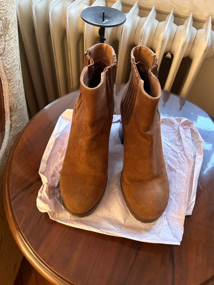 Kahverengi süet kadın botları, parlak dolgu topuk ve tokalı detaylara sahip. Trendy ve bohem tarzda, günlük kullanıma uygun.
