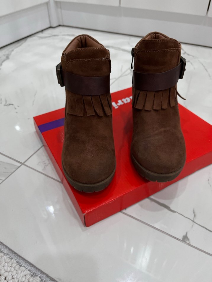 Kahverengi süet kadın bot, dolgu topuklu, tokalı ve püskül detaylı. Rahat sokak stili ve günlük kullanım için uygundur. Sıcak ve trend bir görünüm sunar.