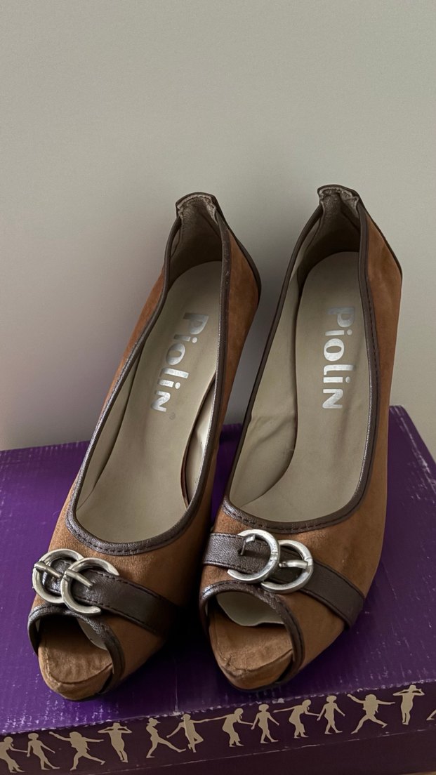 Kahverengi süet kadın stiletto, dolgu topuklu ve tokalı detaylı parlak yüzeye sahip. Günlük kullanıma uygun çağdaş tarzda.