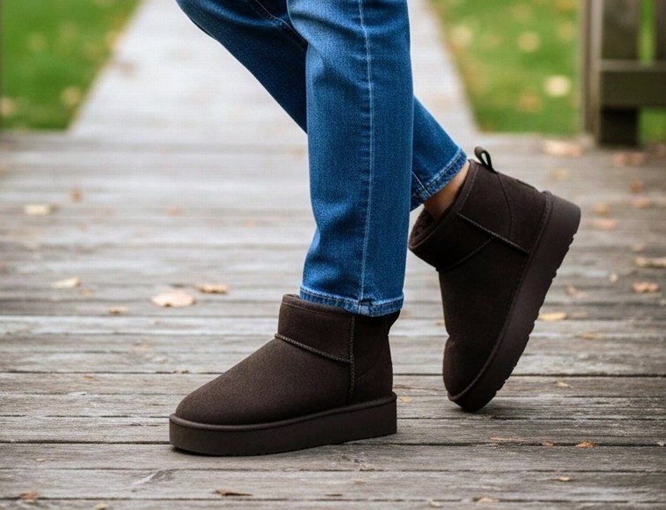 Koyu kahverengi süet malzemeden dolgu topuklu, kadın botu. Günlük kullanıma uygun, desen içermeyen rahat bir sokak stili botu.