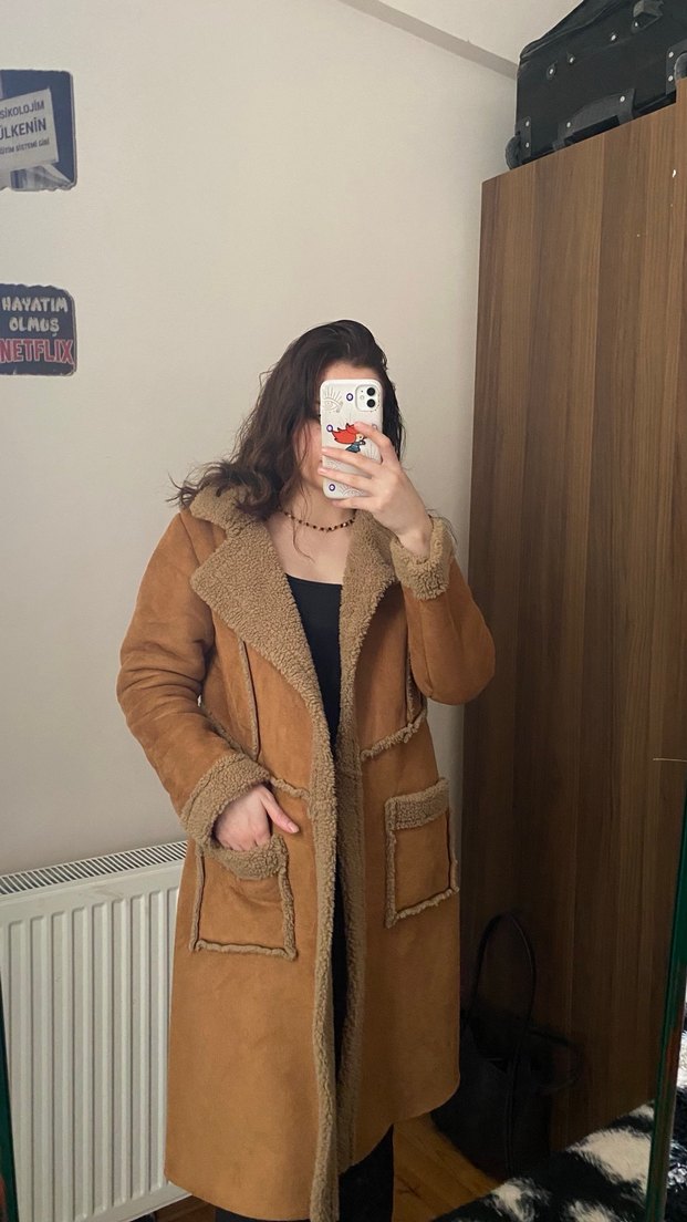 Kahverengi süet kadın ceket, bol kesim ve kürk detaylıdır. Normal boy, uzun kollu ve parlak görünümlüdür. Günlük rahat kullanıma uygundur. Hafif agir degil asiri sicak tutuyor 2 defa falan giyildi