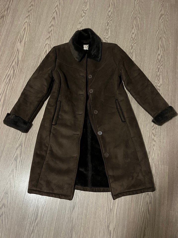 Kahverengi süet kadın kaban, kürklü yakası ve uzun kollu. Midi boyda, rahat kesim ve günlük kullanım için uygun. Sokak modasına uygun, sıcak tutar.