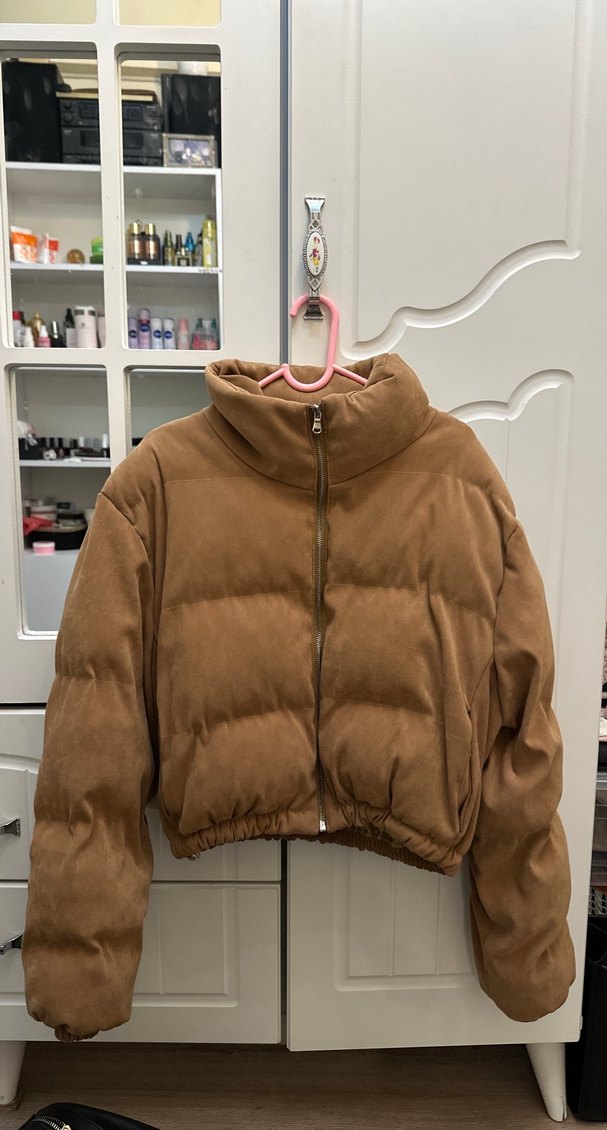 Kahverengi süet kumaştan, yüksek yakalı ve fermuarlı, uzun kollu, normal midi boyda, rahat kesim kadın kışlık ceket. Günlük sokak stiline uygun, sade ve şık tasarım.