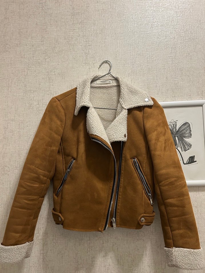 Kahverengi süet ceket, kürklü yakası ve dar kesimiyle midi boyda. Uzun kollu ve fermuarlı ceplidir, trend sokak stili için uygundur. Mango marka S beden