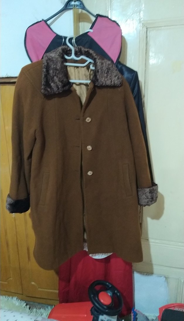 Kahverengi süet kumaştan, gevşek kesim, kürklü yakalı ve manşetli midi uzunlukta kadın kaban. Günlük kullanıma uygun, rahat sokak stiliyle uyumlu.