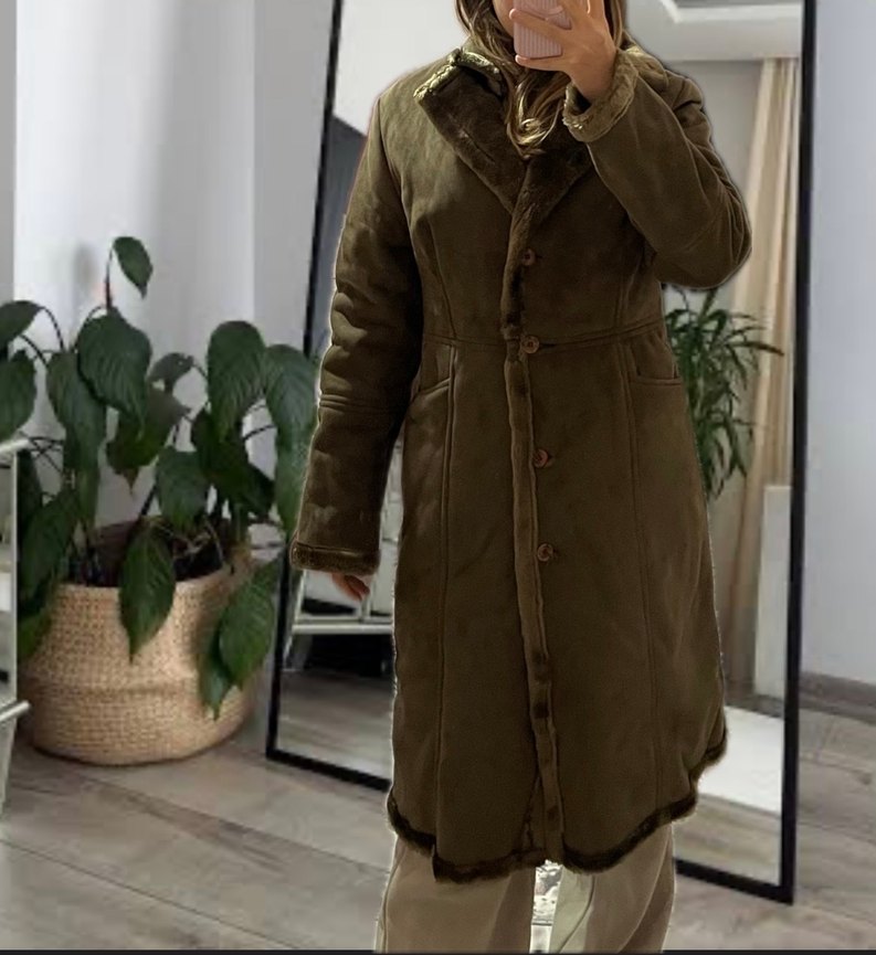 Kahverengi süet kadın kaban, kürk detaylı ve kesik yaka ile günlük kullanım için rahat uzun kollu midi boydadır. Rahat kesimi ve desensiz tasarımıyla trend sokak stiline uygundur. sicacik tutar cok şıktir