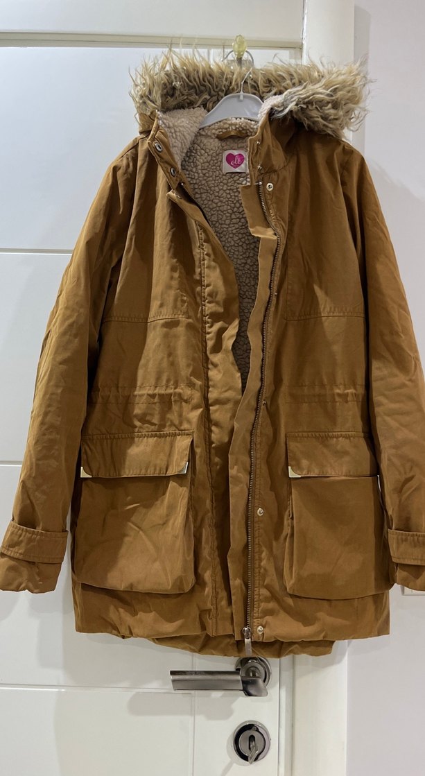 Kahverengi süet kadın mont, kürklü kapüşonlu, uzun kollu ve bol kesimdir. Notlu yaka ve midi boyda, rahat sokak stiline uygundur.