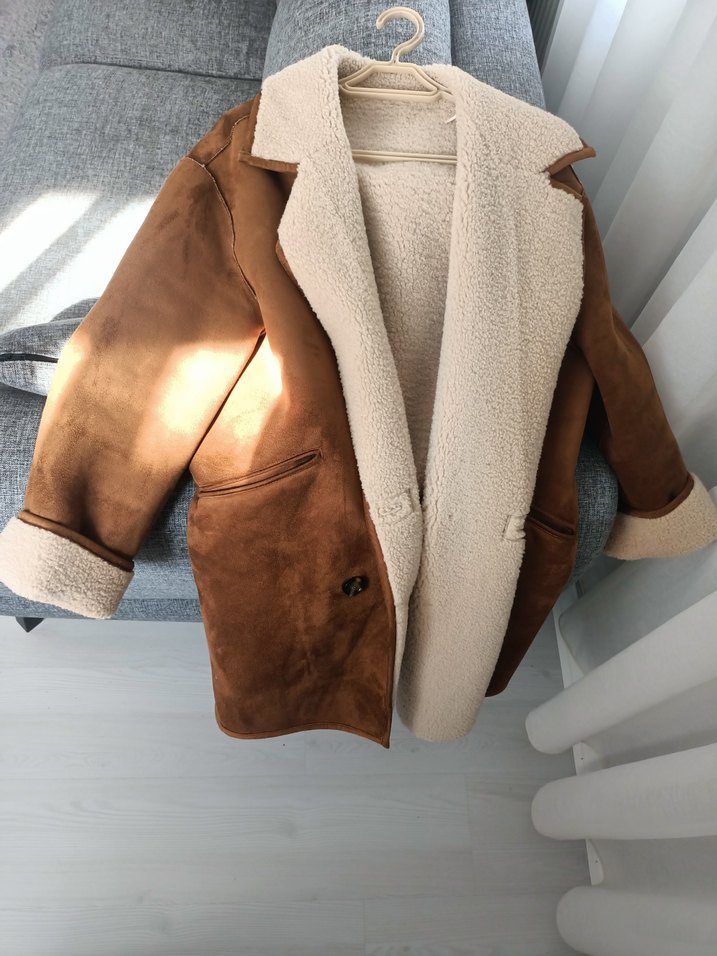 Kahverengi süet kadın mont, kürk detaylı iç yüzeyi ve kesik yakası ile dikkat çekiyor. Salaş kesim, uzun kollu ve midi boyda, günlük kullanıma uygun.