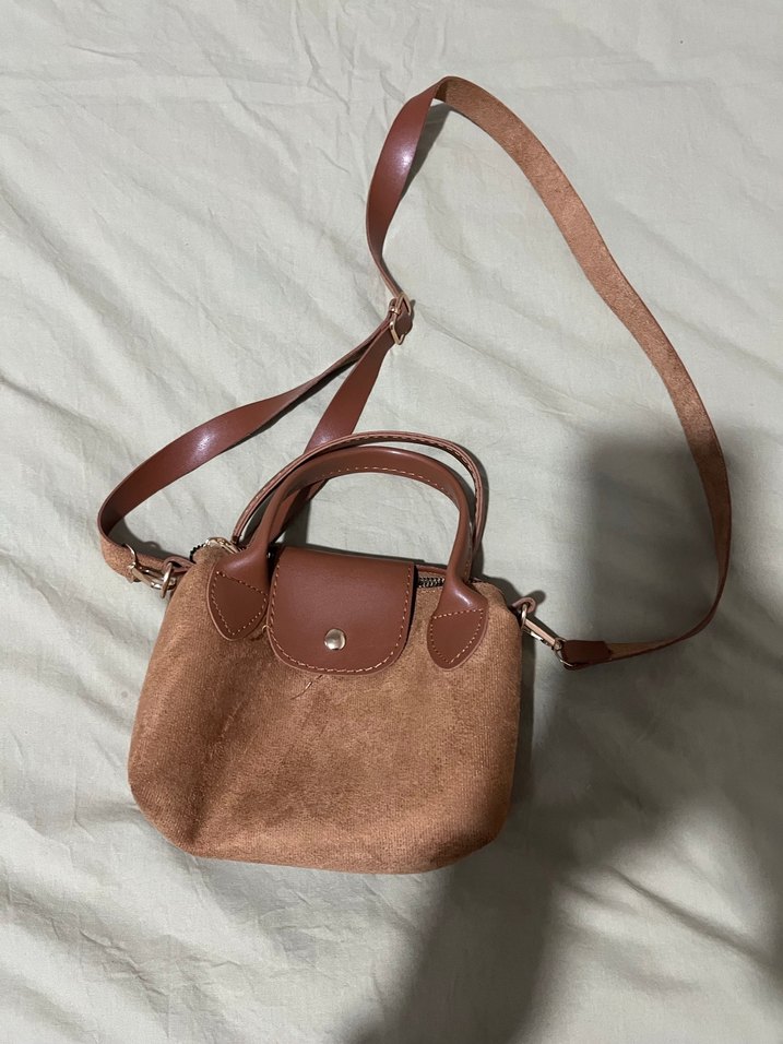 Kahverengi süet malzemeden, tokalı kayışlı, desen içermeyen minimalist tasarımlı kadın omuz çantası, günlük sokak stiline uygundur.