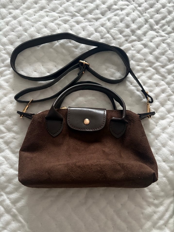 Kahverengi süet çanta, tokalı kapak ve çıkarılabilir omuz askısıyla dikkat çeker. Günlük kullanıma uygun, trend sokak stiline uyum sağlar.