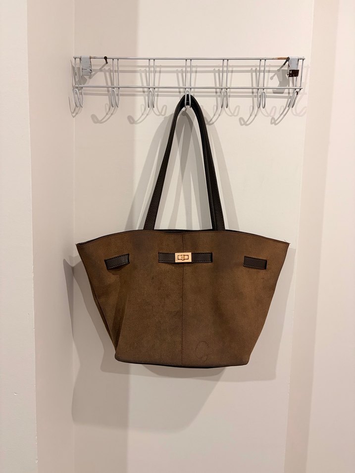 Kahverengi süet kadın çantası, tokalı tasarıma ve koyu renklere sahiptir. Günlük kullanıma uygun, desen içermeyen çağdaş Paris tarzında bir çantadır.