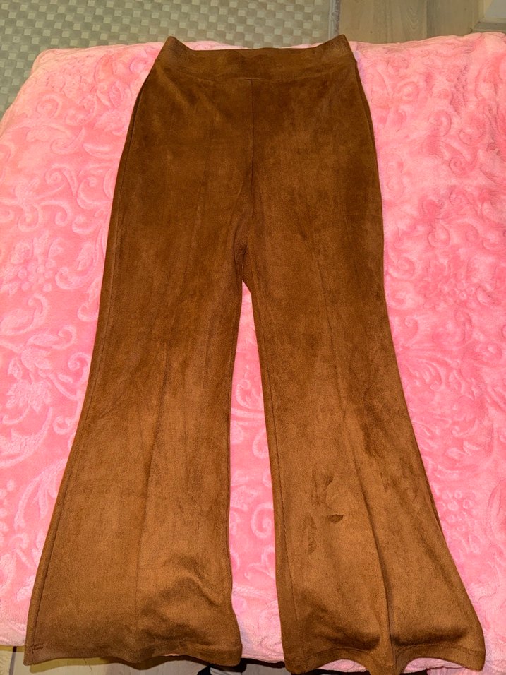 Kahverengi süet kumaştan, kürk detaylı, midi boy ve dar kesim kadın pantolonu. Rahat ve retro tarza uygun, günlük kullanıma ideal.