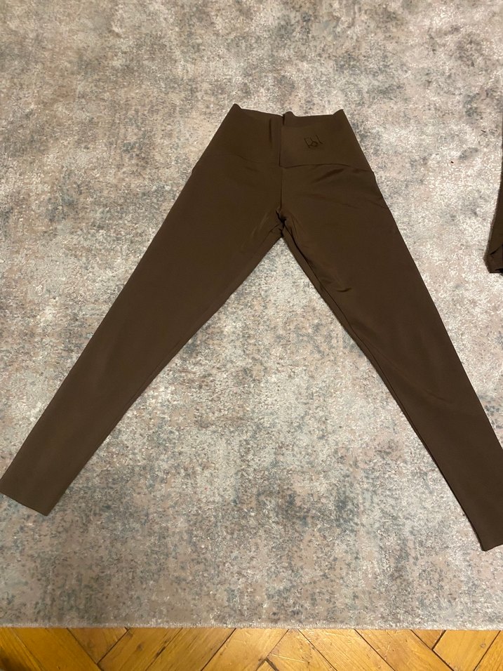 Kahverengi süet kumaştan, midi boy ve dar kesim kadın tayt. Rahat şıklık ve sokak stili için uygundur, günlük kullanıma idealdir. ️