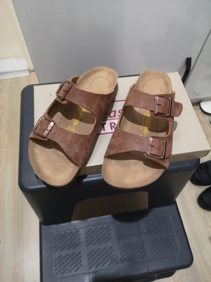 Kahverengi süet kadın terlik, çift tokalı ve dolgu topuklu, günlük sokak kullanımı için uygundur. Desensiz, koyu renk tasarıma sahiptir. Orjinal değil ama çok rahat