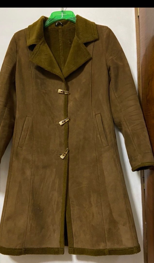 Kahverengi süet kumaştan, düğmeli, uzun kollu, notched lapel yakalı kadın kaban. Rahat kesimi ve sade tasarımıyla günlük kullanıma uygundur.