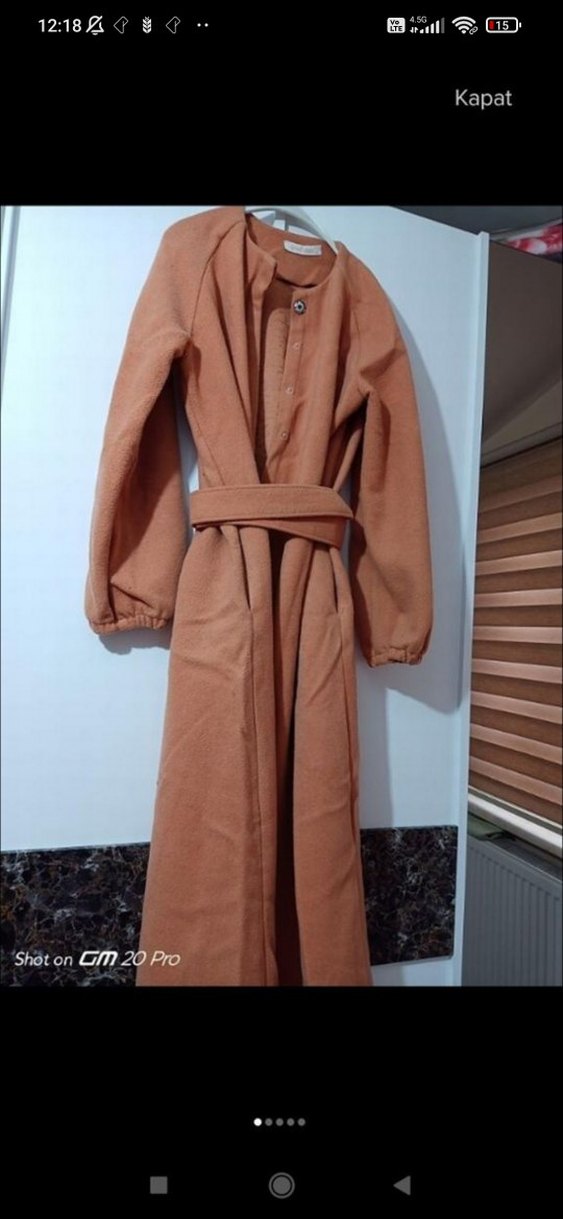 Kahverengi süet uzun kaban, kemerli ve uzun kolludur. Notlu yakası ve rahat kesimiyle günlük kullanıma uygun bohem tarzda bir üründür.
