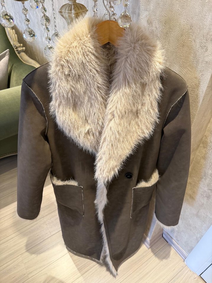 Kahverengi süet uzun kaban, detaylı suni kürk yakalı, uzun kollu ve regular fit kesimlidir. Günlük sokak stili için uygundur.