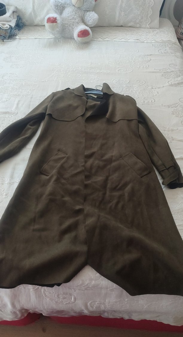 Kahverengi süet kumaştan, düğmeli ve geniş kesim uzun trençkot. Notlu yakası ve uzun kolları ile günlük kullanıma uygun.