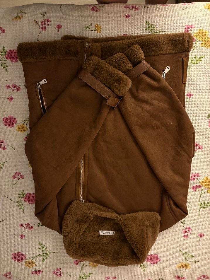 Kahverengi süet malzemeden yapılmış, kapüşonlu ve fermuarlı ceplere sahip, dar kesim kadın ceket. Askılı kollu ve rahat dokulu, günlük kullanıma uygun.