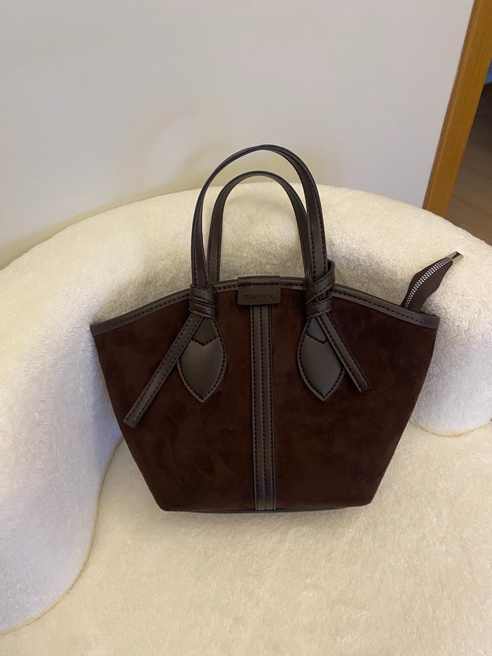 Kahverengi süet kumaştan, kemer detaylı ve çift kulplu kadın çantası. Klasik zarafet ve çağdaş Paris tarzını birleştirir. markası belirsz