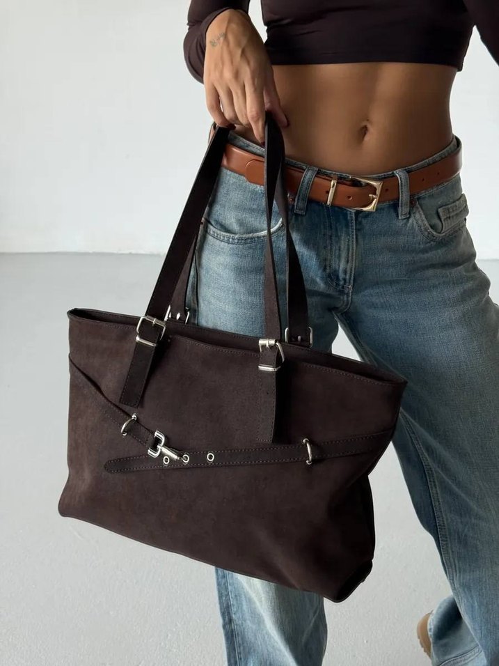 Kahverengi süet malzemeden, kemer detaylı ve uzun saplı kadın çantası. Günlük sokak stili için uygun, desensiz ve rahat bir tasarıma sahip.