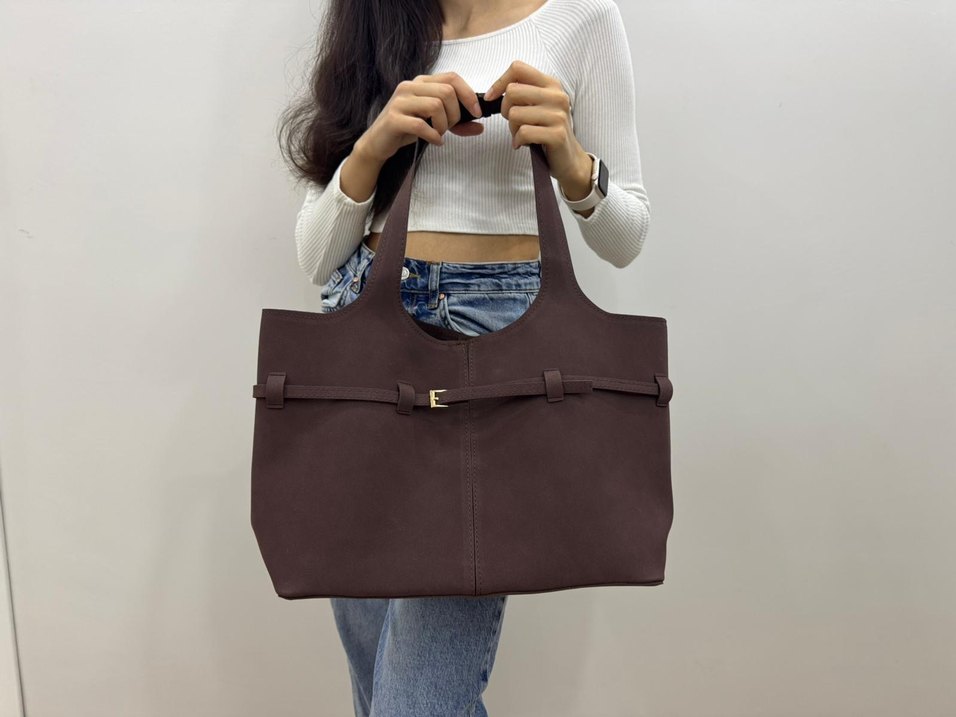 Kahverengi süet malzemeden, kemer detaylı, minimalist ve desensiz kadın çantası. Sokak stili ve günlük kullanıma uygun.