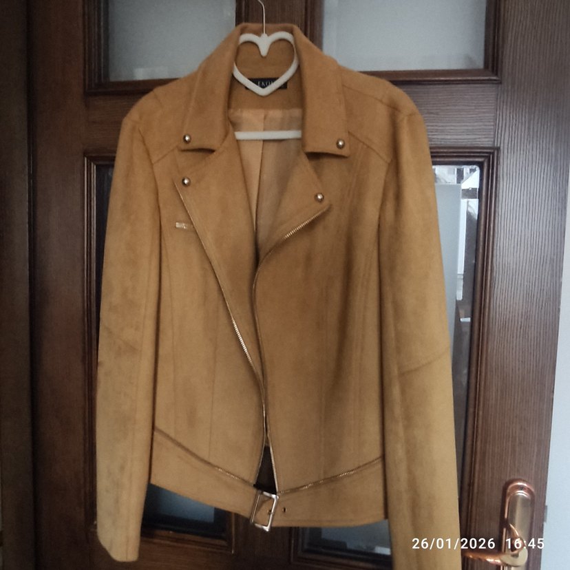 Kahverengi süet deri ceket, kesik yaka ve askılı kollara sahip. Kemerli, kısa ve regular fit, günlük kullanım için uygun parlak görünümlü klasik parça.
