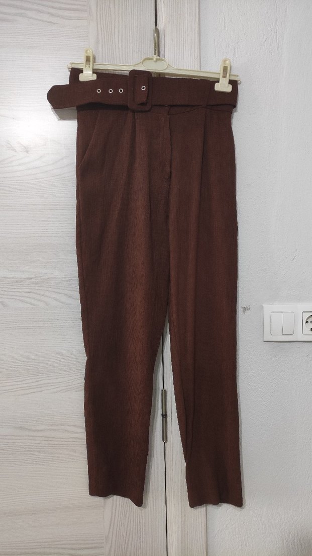 Kahverengi süet kumaştan, kemerli ve bol kesimli midi boy kadın pantolon. Rahat ve bohem tarzda, günlük kullanıma uygun. Hiç giyilmedi.