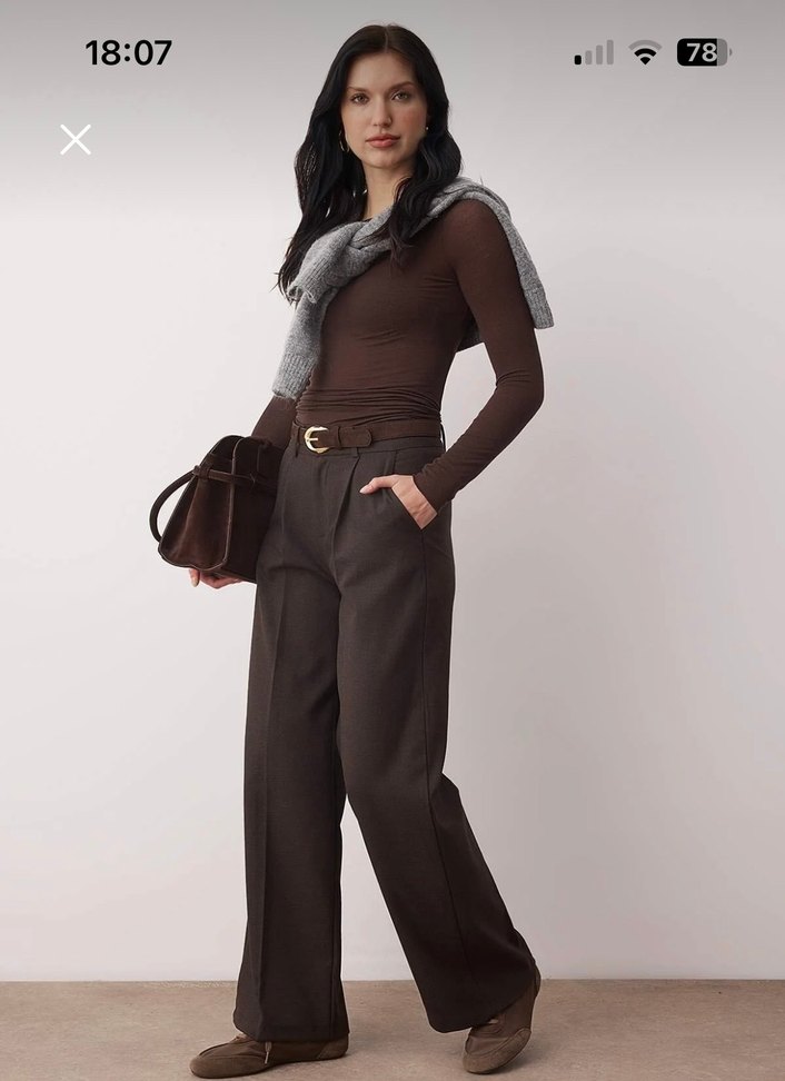 Kahverengi süet kumaştan, kemerli ve normal boy midi uzunluğunda kadın pantolonu. Günlük iş stiline uygun, desensiz ve rahat kesim.