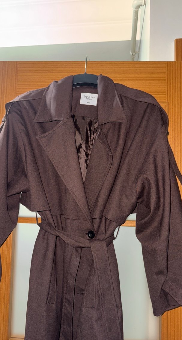 Kahverengi süet kumaştan, kemerli ve regular fit kesime sahip uzun trençkot. Notched lapel yaka ve strappy kollu, günlük kullanım için uygun.