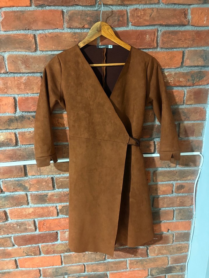 Kahverengi süet kumaştan, kemerli ve uzun kollu, notched lapel yakalı, rahat kesim kadın trençkot. Sokak stiline uygun, uzun boy.