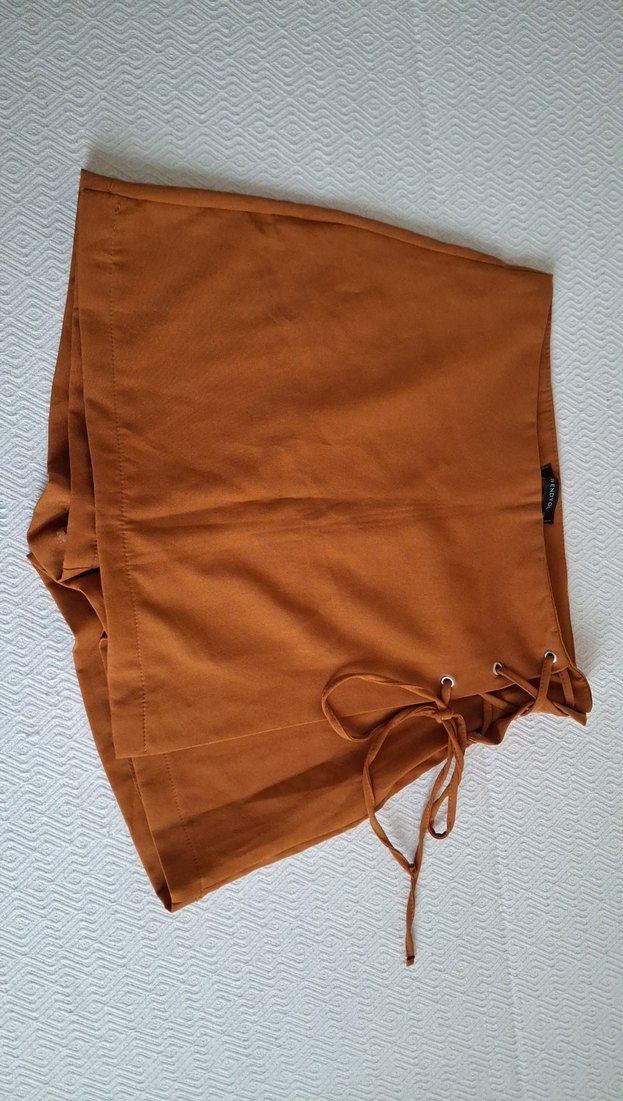 Bu kahverengi süet midi şort etek, bol kesim ve kemer detayıyla dikkat çeker. Sade tasarımıyla günlük dış mekan kullanımı için uygundur.