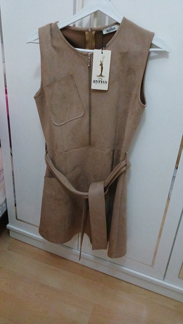 Kahverengi süet malzemeden yapılmış, kemerli ve kolsuz mini elbise Halter yaka ve ön fermuar detayı vardır. Günlük kullanıma uygundur.