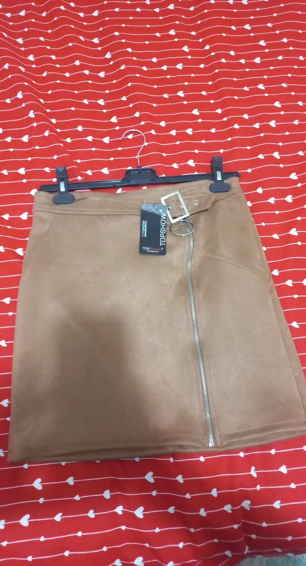 Kahverengi süet malzemeden, kemerli ve ön fermuarlı, dar kesim mini etek. Romantik buluşmalar için uygun, şık ve rahat görünümlü.