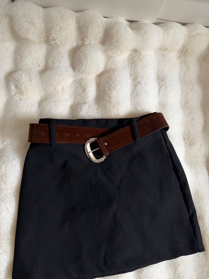 Kahverengi Süet Kemerli Mini Etek