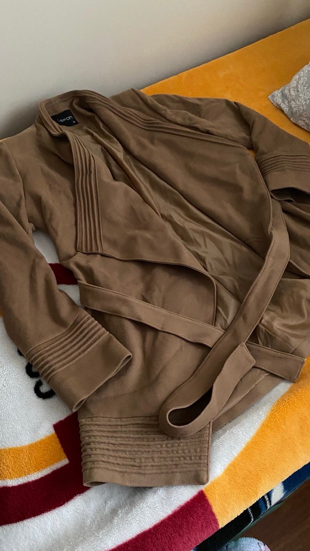 Kahverengi süet ceket kemerli bel, bol kesim ve kesik yakaya sahiptir. Uzun boylu ve askılı kolludur, günlük kullanıma uygun rahat sokak stili sunar. marka temsili