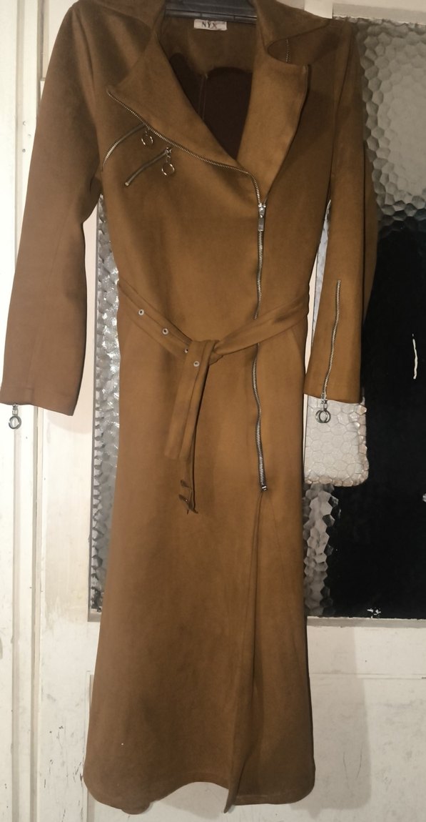Kemerli beli ve çentikli yaka detaylı, kahverengi süet kumaştan uzun ve dar kesim trençkot. Sokak modasına uygun, Parisli stilini yansıtan tasarım.