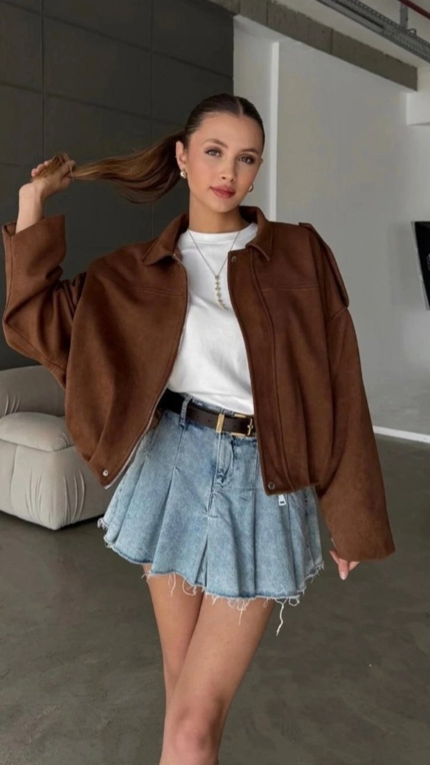Kahverengi süet kumaştan, bol kesim kısa ceket. Uzun kollu, kemerli ve kesik yakalı, günlük kullanıma uygun. bedenler mevcut✅✅