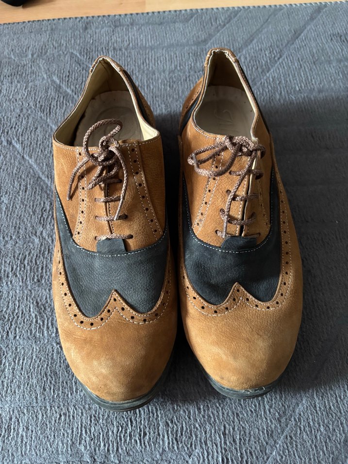 Kahverengi süet erkek oxford ayakkabılar, kama topuklu ve tokalı detaylı, gri vurguya sahip. Günlük kullanım için klasik ve geleneksel tarzda. temiz kullanildi yirtik yipranma vs yok 40 numara