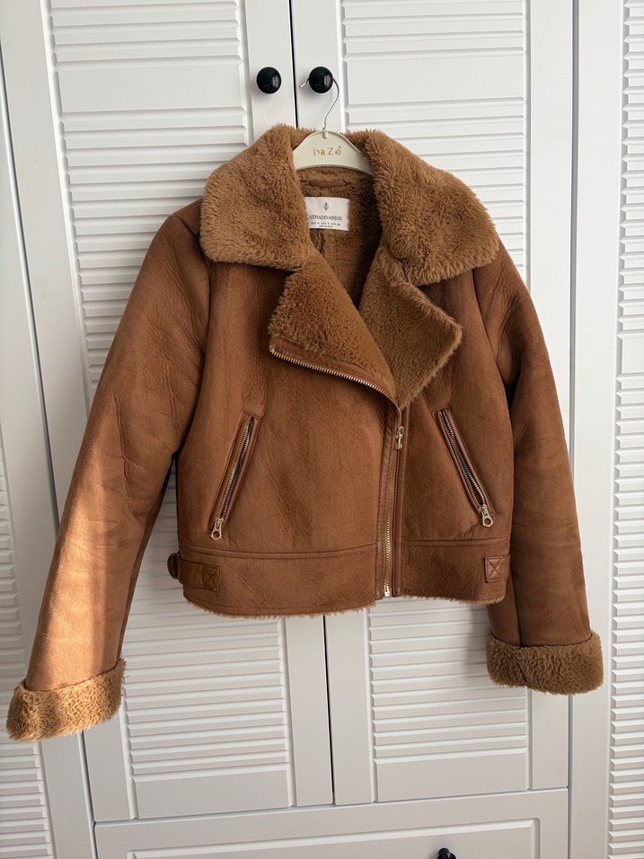 Kahverengi süet dış yüzeyi ve kürk detaylı yakası ile bileklerinde rahatlık sağlayan, normal boy, dar kesim kadın cekettir. Notlu yaka ve uzun kolludur.