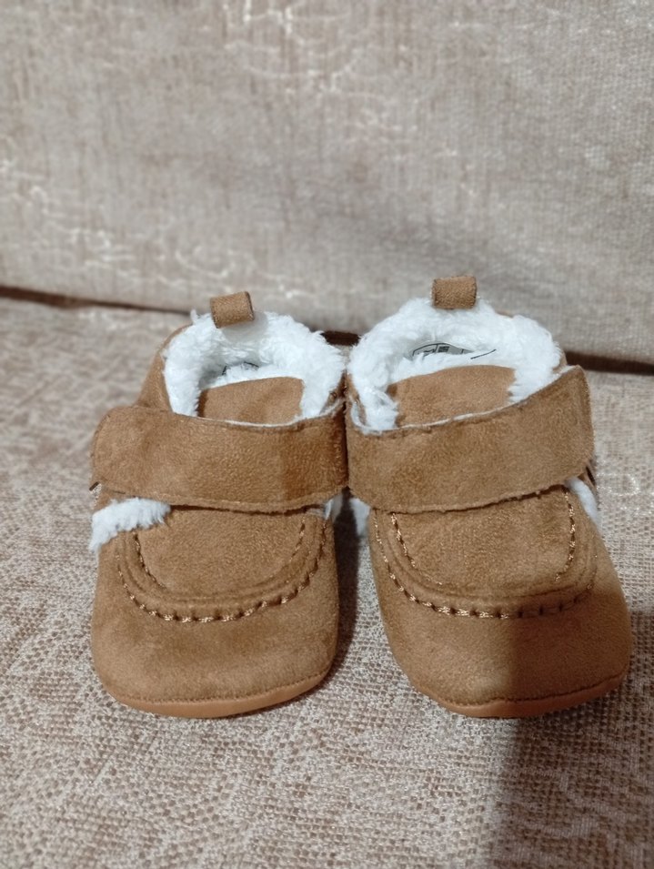 Kahverengi süet erkek bebek ayakkabısı, yumuşak kürk detaylarıyla konfor ve sıcaklık sağlar. Pastel tonlarda sade ve desensiz tasarım.