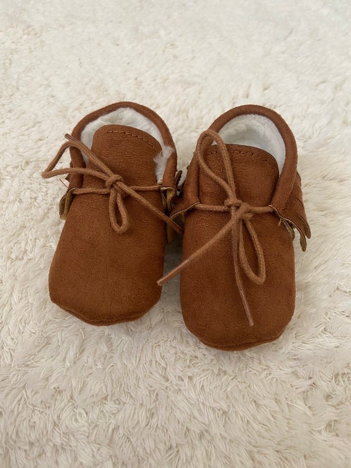 Kahverengi süetten yapılmış, içi kürklü erkek bebek patik. Düz, bohem tarzda ve yumuşak dokuludur.