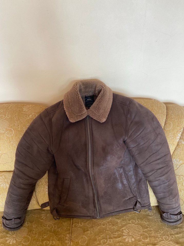 Kahverengi süet malzemeden, kürklü yakalı, dar kesim ve uzun kollu erkek ceket. Notched lapel yakası ve midi boyuyla rahat ve şık bir sokak stili sunar.