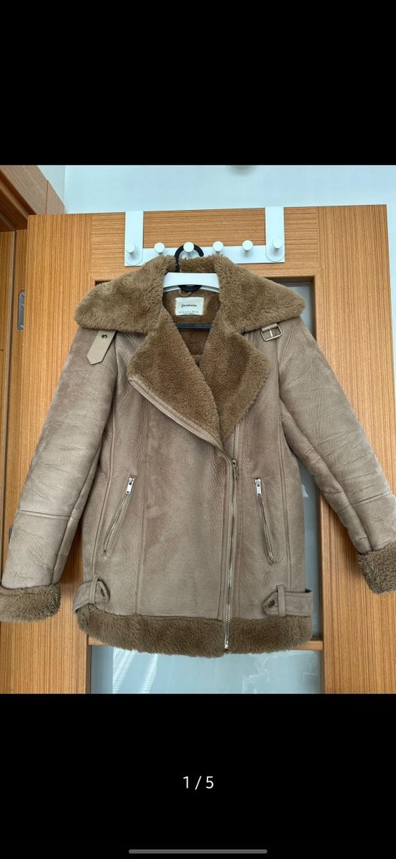 Kahverengi süet ceket, yaka, manşet ve etek ucunda kürk detaylarına sahiptir. Notlu yaka, uzun kollu ve midi boyda, günlük rahat kullanım için uygundur. yakadaki kemerlerini kestim fotografta belirttim