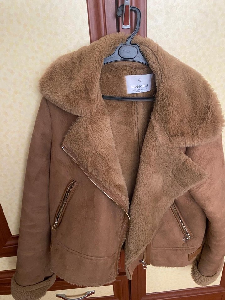 Kahverengi süet kumaştan, kürklü detaylı, kesimli ve normal boyda, uzun kollu kadın ceket. Rahat ve şık sokak stili için uygundur.