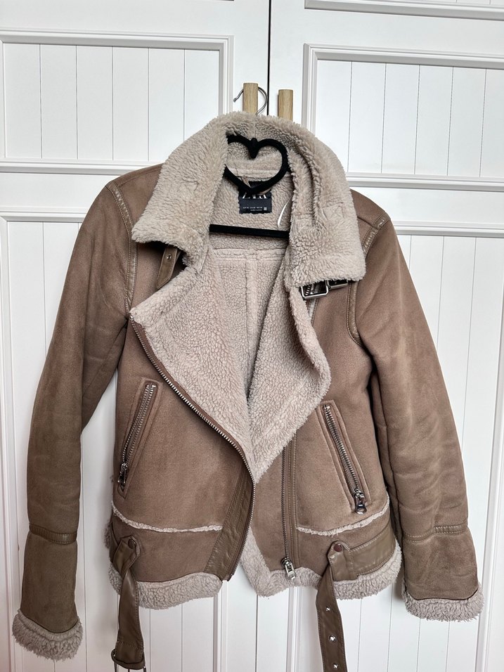 Kahverengi süet kadın ceket, kürk detaylı, yakası kesik, dar kesim ve fermuarlı ceplerle. Günlük kullanım için sıcak ve şık.